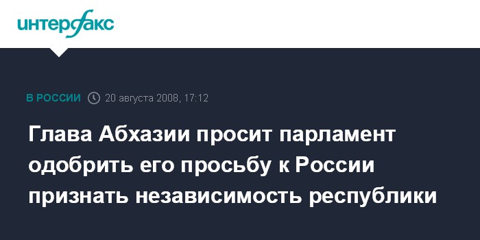 Москва. 20 августа. INTERFAX.RU - Президент Абхазии Сергей Багапш обратился к парламенту республики за одобрением его обращения к руководству России с просьбой признать независимость Абхазии.