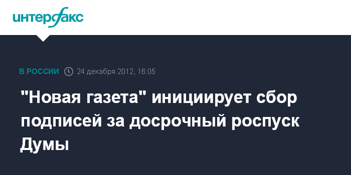 Москва. 24 декабря. INTERFAX.RU - "Новая газета" через свой сайт начала сбор подписей за отставку Государственной Думы, отложившей рассмотрение 100 тыс. подписей против закона о запрете усыновления иностранцами российских сирот, которые были собранны на сайте издания и переданы в парламент перед окончательным голосованием.