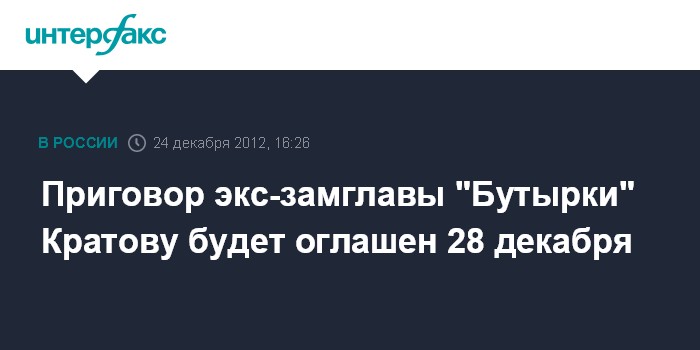 Москва. 24 декабря. INTERFAX.RU - Тверской суд Москвы огласит 28 декабря приговор бывшему замначальнику СИЗО "Бутырка" Дмитрию Кратову, которого привлекали за халатность, связывая ее с гибелью юриста фонда Hermitage Capital Сергея Магнитского.