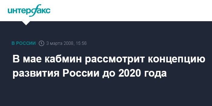 Москва. 3 марта. INTERFAX.RU - Президент РФ Владимир Путин на встрече с правительством сообщил, что в мае этого года министры должны рассмотреть Концепцию долгосрочного развития страны до 2020 года.