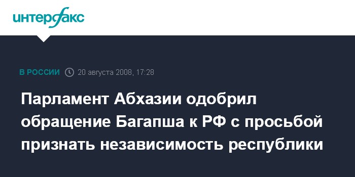 Москва. 20 августа. INTERFAX.RU - Парламент Абхазии принял обращение к президенту России и палатам Федерального Собрания РФ с просьбой о признании независимости республики.