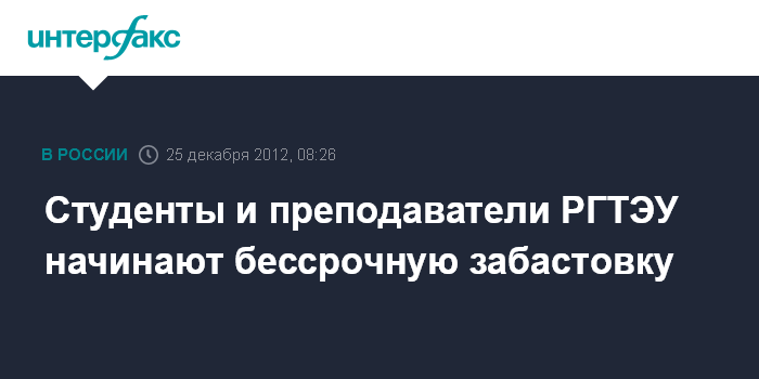 Москва. 25 декабря. INTERFAX.RU - Студенты и преподаватели Российского государственного торгово-экономического университета (РГТЭУ) начинают бессрочную забастовку с требованием отменить решение о присоединении вуза к Российскому экономическому университету (РЭУ) имени Плеханова и результаты проведенного Минобрнауки РФ мониторинга вузов.