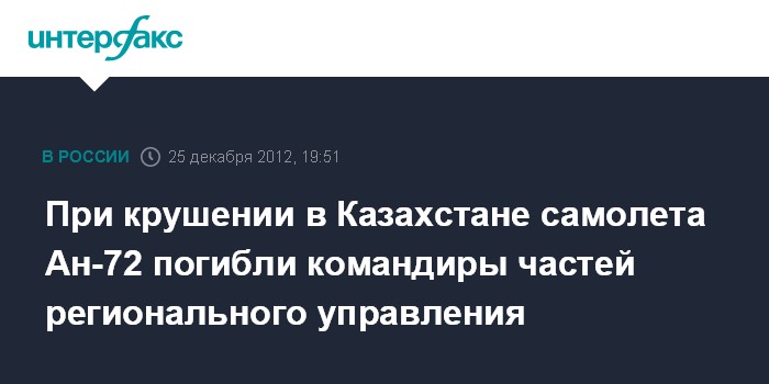 Астана. 25 декабря. INTERFAX.RU - В числе погибших при крушении самолета Ан-72 пограничной службы Комитета нацбезопасности Казахстана командиры частей регионального управления "Онтустик" ("Юг"), сообщил во вторник агентству "Интерфакс-Казахстан" источник в силовых структурах.