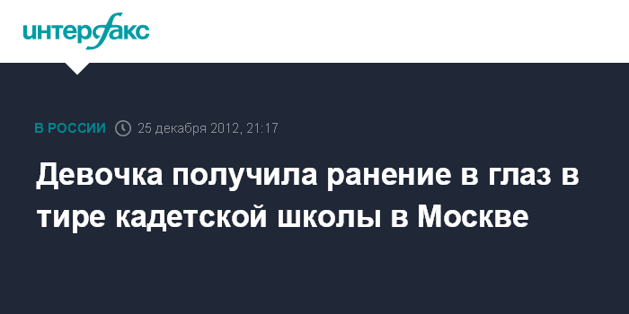 Москва. 25 декабря. INTERFAX.RU - На севере Москвы девочка получила травму глаза, по предварительным данным, ее ранила срикошетившая пуля в тире кадетской школы, сообщили "Интерфаксу" в ГУ МВД России по Москве.