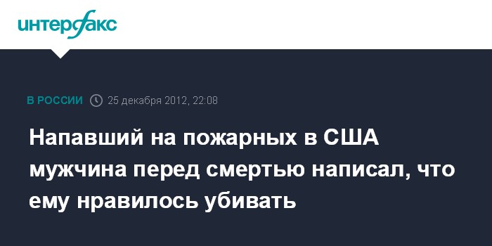 Вашингтон. 25 декабря. INTERFAX.RU - Мужчина, напавший на пожарных в городе Вебстере в штате Нью-Йорк, предварительно оставил предсмертную записку, сообщили во вторник журналистам представители местной полиции.
