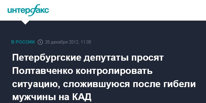 Санкт-Петербург. 26 декабря. INTERFAX.RU - Депутатский запрос с просьбой к губернатору Петербурга Георгию Полтавченко взять под личный контроль ситуацию, сложившуюся после гибели мужчины на КАД, утвердили парламентарии города, передает корреспондент "Интерфакса".