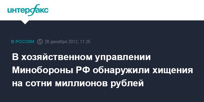 Москва. 26 декабря. INTERFAX.RU - Главная военная прокуратура (ГВП) вскрыла хищения почти на 300 млн рублей в хозяйственном управлении (ХОЗУ) Минобороны России - поставлен вопрос о возбуждении уголовного дела по статье "Мошенничество в особо крупном размере".