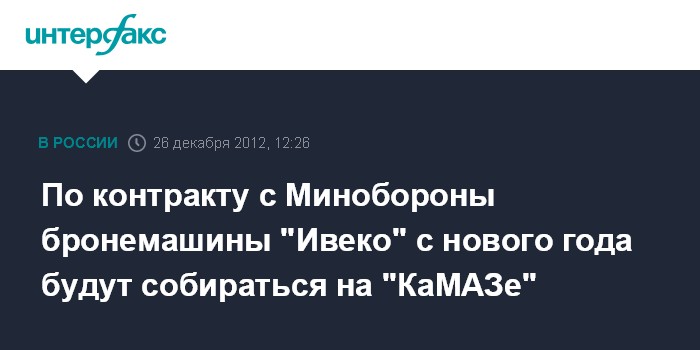 Москва.26 декабря. ИНТЕРФАКС - Итальянская компания в 2012-2013 гг. поставит российской армии 358 бронемашин "Ивеко", сообщил в среду журналистам замминистра обороны РФ Юрий Борисов.