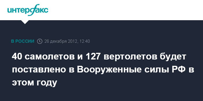 Москва. 26 декабря. INTERFAX.RU - Российская армия в 2012 году получит от промышленности 40 боевых самолетов и 127 вертолетов, сообщил в среду журналистам замминистра обороны РФ Юрий Борисов.