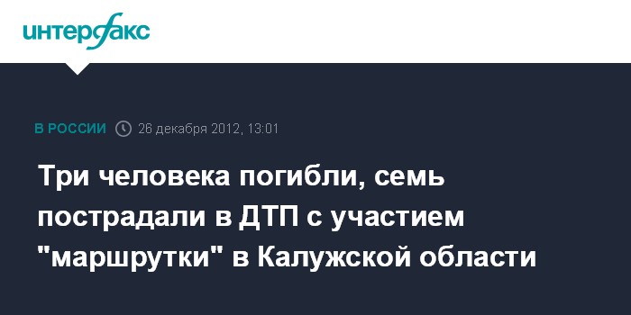 Москва. 26 декабря. INTERFAX.RU - В Калужской области маршрутное такси попало в аварию, три человека погибли, сообщили "Интерфаксу" в ГУ МЧС по региону.