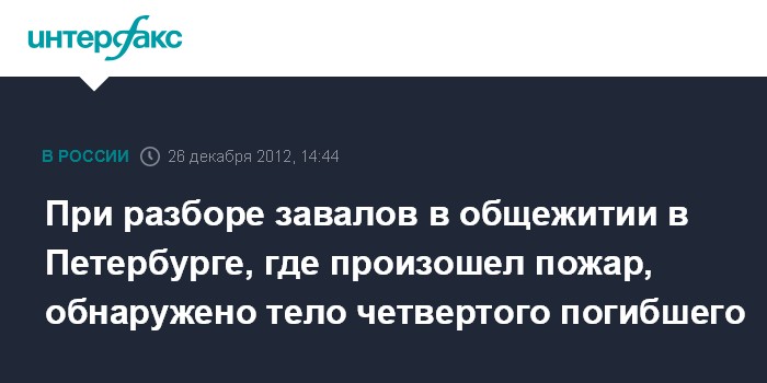 Санкт-Петербург. 26 декабря. INTERFAX.RU - Число погибших на пожаре в общежитии Кировского завода в Петербурге возросло до четырех. "Обнаружено тело четвертого погибшего", - сообщили "Интерфаксу" в Главном управлении МЧС по городу.