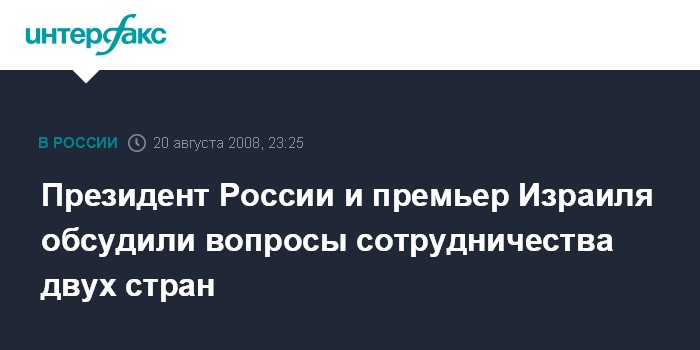 Москва. 20 августа. ИНТЕРФАКС - Президент России Дмитрий Медведев и премьер-министр Израиля Эхуд Ольмерт обсудили в среду по телефону "конкретные вопросы российско-израильского сотрудничества, выразив удовлетворение его поступательным развитием".