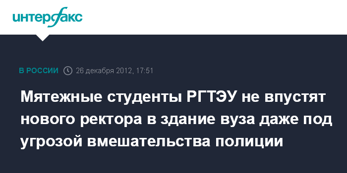 Москва. 26 декабря. INTERFAX.RU - Акция студентов РГТЭУ продолжится, несмотря на возможные действия полиции в связи с заявлением нового ректора вуза Андрея Шкляева о том, что его не пустили на работу. "Акция будет продолжаться в любом случае. Мы готовы к любому развитию событий", - сказал "Интерфаксу" руководитель пресс-службы РГТЭУ Андрей Гара в среду.