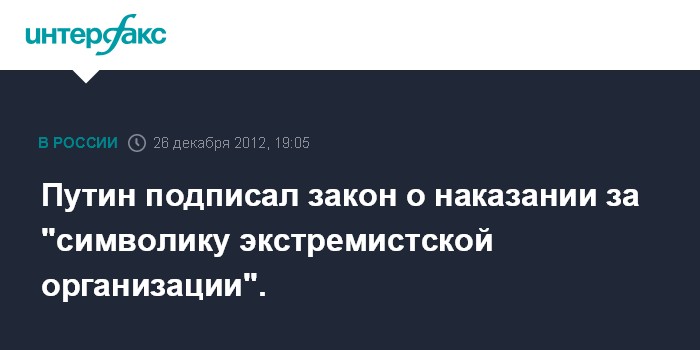 Москва. 26 декабря. INTERFAX.RU - Президент России Владимир Путин подписал закон, усиливающий административную ответственность за пропаганду и публичное демонстрирование нацистской и экстремистской атрибутики или символики.