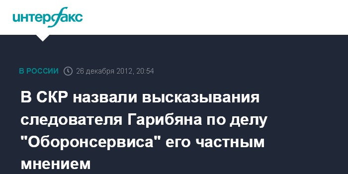 Москва. 26 декабря. INTERFAX.RU - Высказывание следователя Петроса Гарибяна по делу "Оборонсервиса" является его частным мнением и не основано на материалах этого дела, заявил "Интерфаксу" официальный представитель СК РФ Владимир Маркин.