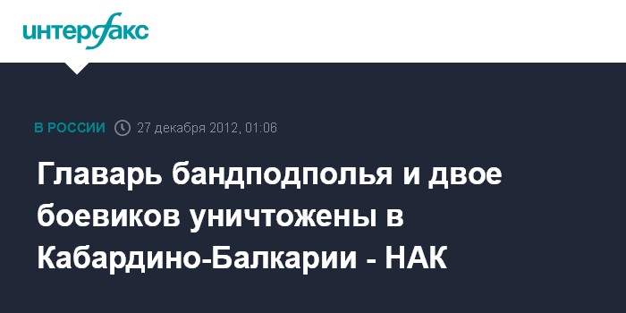 Москва. 27 декабря. ИНТЕРФАКС - Один из лидеров бандподполья и два боевика уничтожены в ходе спецоперации в Баксанском районе Кабардино-Балкарии, сообщает в ночь на четверг информационный центр Национального антитеррористического комитета.