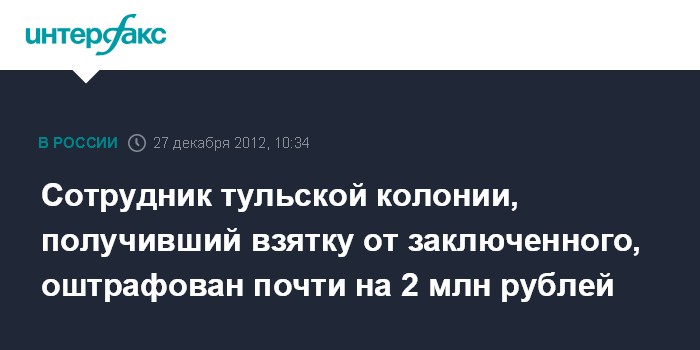 Сотрудник тульской колонии, получивший взятку от заключенного, оштрафован почти на 2 млн рублей