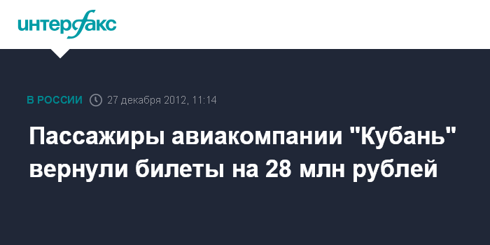 Краснодар. 27 декабря. INTERFAX.RU - Пассажиры авиакомпании "Кубань" ("Авиалинии Кубани") вернули 6 тыс. билетов на общую сумму более 28 млн рублей, говорится в сообщении авиаперевозчика.