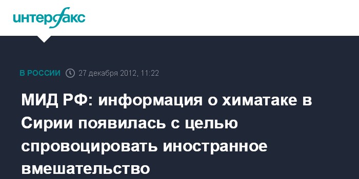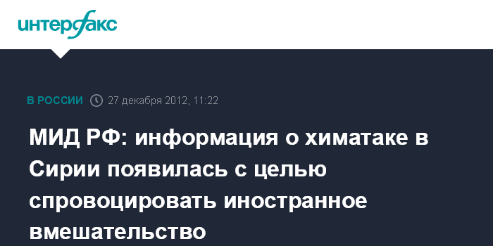 Москва. 27 декабря. INTERFAX.RU - Информация о применении химического оружия в Сирии является провокацией с целью добиться иностранного вмешательства в сирийский конфликт, заявил официальный представитель МИД РФ Александр Лукашевич.