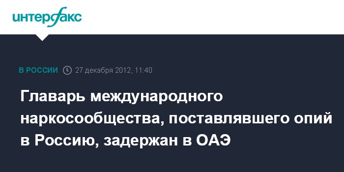 Москва. 27 декабря. INTERFAX.RU - Один из главарей преступного сообщества, организовавшего поставки крупных партий наркотиков из Афганистана в Россию, задержан в Объединенных Арабских Эмиратах в ходе спецоперации.