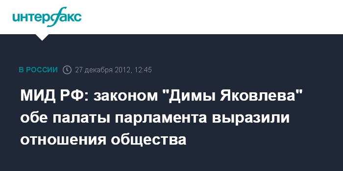 МИД РФ: законом "Димы Яковлева" обе палаты парламента выразили отношения общества