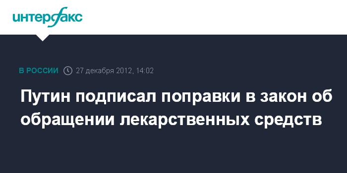 Москва. 27 декабря. INTERFAX.RU - Президент России Владимир Путин в четверг подписал федеральный закон "О внесении изменений в Федеральный закон "Об обращении лекарственных средств", сообщила пресс-служба президента.
