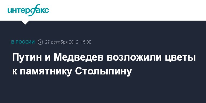 Москва. 27 декабря. INTERFAX.RU - Президент России Владимир Путин и председатель правительства Дмитрий Медведев возложили в четверг цветы к памятнику российскому государственному деятелю Петру Столыпину.