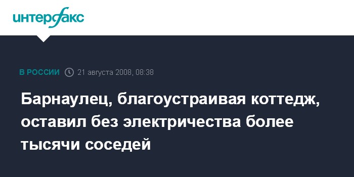 Москва. 21 августа. INTERFAX.RU - Житель Барнаула, копая землю возле своего коттеджа, оставил без электричества 1150 потребителей.