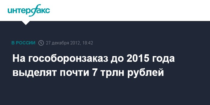 "В 2013, а также 2014-2015 годах гособоронзаказ будет расти по той простой причине, что мы заканчиваем научно-исследовательские и опытно-конструкторские работы и переходим к серийному производству вооружения и военной техники. Примерные суммы назову. На следующий год - это порядка 1,9 трлн рублей, на 2014 - примерно 2,2 трлн рублей, на 2015 - 2,8 трлн рублей". - сказал Рогозин в и интервью телеканалу "Россия-24".