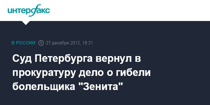 Москва. 27 декабря. INTERFAX.RU - Невский районный суд Петербурга вернул в прокуратуру уголовное дело в отношении троих граждан Узбекистана, после драки с которыми погиб болельщик "Зенита" Роман Ловчиков.