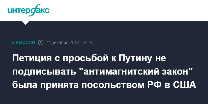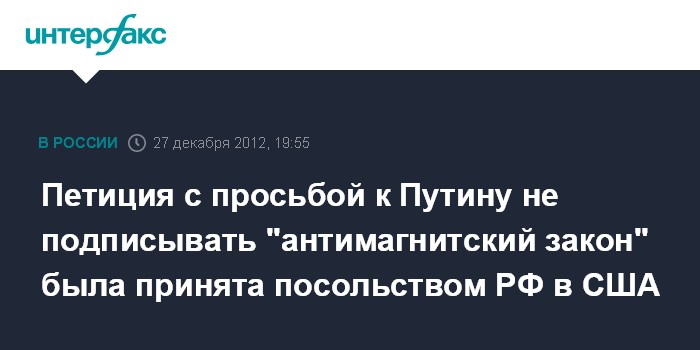 Петиция с просьбой к Путину не подписывать "антимагнитский закон" была принята посольством РФ в США