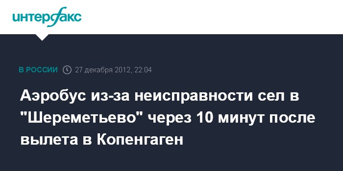 Аэробус из-за неисправности сел в "Шереметьево" через 10 минут после вылета в Копенгаген
