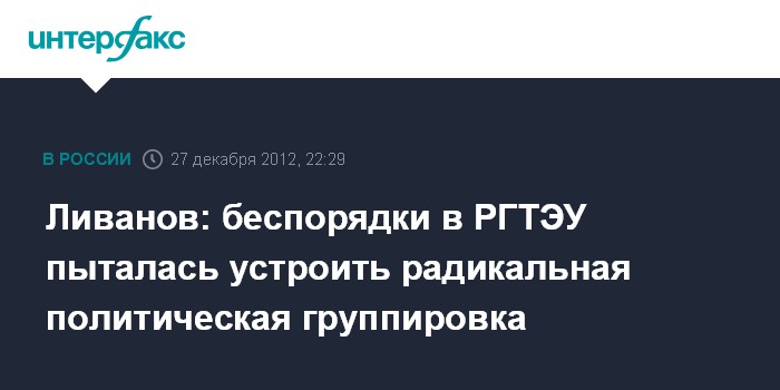 Москва. 27 декабря. INTERFAX.RU - Министр образования и науки РФ Дмитрий Ливанов благодарит коллектив РГТЭУ, не поддавшийся на провокацию, устроенную радикальной политической группировкой в вузе. "Была попытка орг-ции беспорядков в гос. вузе радик. полит. группировкой. Спасибо преп-лям и студентам РГТЭУ, кот. не поддались на провокацию", - написал Ливанов в своем Твиттере в четверг.