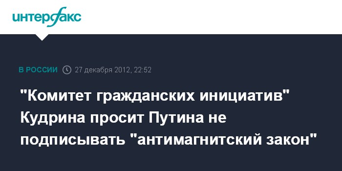 Москва. 27 декабря. INTERFAX.RU - Комитет гражданских инициатив, который возглавляет экс-глава Минфина РФ Алексей Кудрин, обращается к президенту России с предложением отклонить "антимагнитский закон" (или "закон Димы Яковлева").