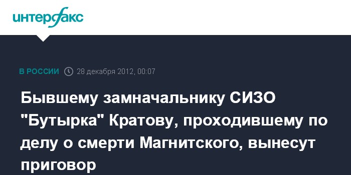 Москва. 28 декабря. INTERFAX.RU - Тверской суд Москвы в пятницу огласит приговор бывшему замначальнику СИЗО "Бутырка" Дмитрию Кратову, которого привлекали за халатность, связывая ее с гибелью юриста фонда Hermitage Capital Сергея Магнитского.