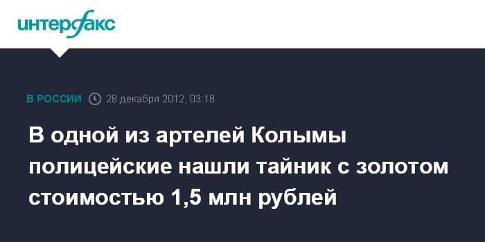 Магадан. 28 декабря. ИНТЕРФАКС-ДАЛЬНИЙ ВОСТОК - На золотодобывающем предприятии города Сусумана на Колыме оперативники регионального УМВД обнаружили тайник с металлом, похожим на золото.