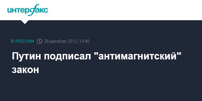 Москва. 28 декабря. INTERFAX.RU - Президент РФ Владимир Путин подписал закон, получивший название "закона Димы Яковлева" и ставший ответом на принятый в США "акт Магнитского".