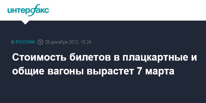 Москва. 28 декабря. INTERFAX.RU - Стоимость билетов в плацкартные и общие вагоны фактически повысится 7 марта 2013 года, следует из приказа Федеральной службы по тарифам (ФСТ) РФ, опубликованного в пятницу в "Российской газете". Документ, который повышает ставки действующих тарифов на 20% в целом по году, вступает в силу 1 января.
