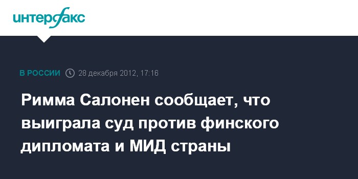 Хельсинки. 28 декабря. INTERFAX.RU - В Финляндии суд города Вантаа вынес в пятницу решение по иску россиянки Риммы Салонен против бывшего консула в Санкт-Петербурге Симо Пиетиляйнена и МИД страны.