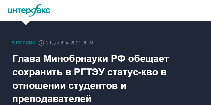 Москва. 28 декабря. INTERFAX.RU - Министр образования и науки РФ Дмитрий Ливанов встретился со студентами РГТЭУ и пообещал им сохранить стипендии и стоимость обучения. "Все студенты продолжат обучение, вам будет предоставлен период для адаптации, все условия, связанные с обучением на коммерческой основе, будут сохранены, преподаватели смогут продолжить работу", - сказал Ливанов на встрече со студентами РГТЭУ в пятницу.