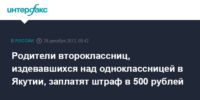 Якутск. 29 декабря. INTERFAX.RU - Родители учениц якутской школы, избивших и оставивших замерзать свою одноклассницу, заплатят штрафы в 500 рублей