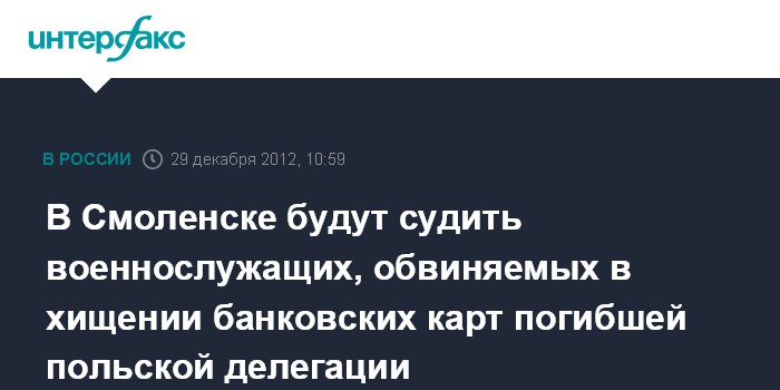 Москва. 29 декабря. INTERFAX.RU - Четверо военнослужащих предстанут перед судом по обвинению в хищении банковских карт членов делегации президента Польши, погибших в начале апреля 2010 г. в авиакатастрофе под Смоленском.