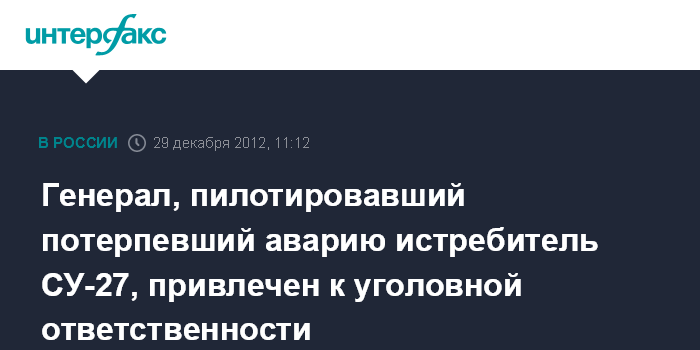 Генерал, пилотировавший потерпевший аварию истребитель СУ-27, привлечен к уголовной ответственности