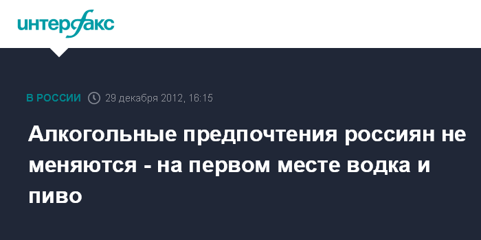 Москва. 29 декабря. INTERFAX.RU - Алкогольные предпочтения россиян не меняются - на первом месте остаются водка и пиво. Об этом свидетельствуют обнародованные в субботу Росстатом данные продажи напитков населению за январь-ноябрь 2012 года.