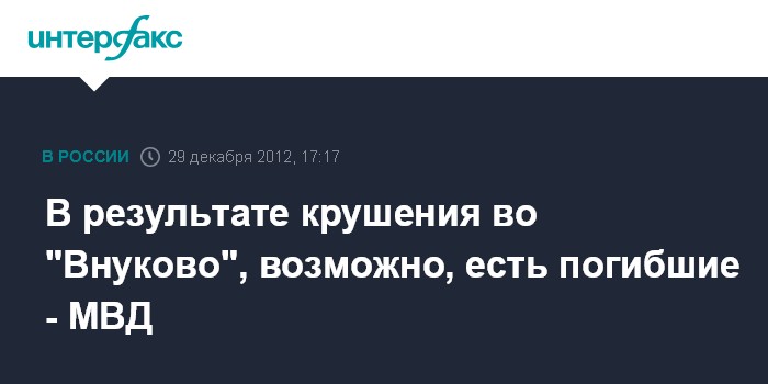 Москва. 29 декабря. INTERFAX.RU - В результате ЧП в столичном аэропорту "Внуково", возможно, есть погибшие, сообщили "Интерфаксу" в пресс-центре МВД.
