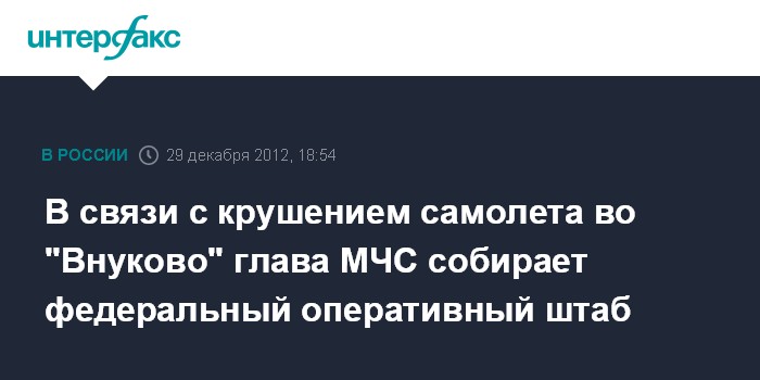 Москва. 29 декабря. INTERFAX.RU - Глава МЧС Владимир Пучков в связи с крушением самолета во "Внуково" собирает федеральный оперативный штаб, сообщили "Интерфаксу" в МЧС РФ.