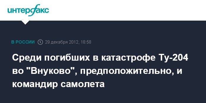 Москва. 29 декабря. INTERFAX.RU - Командир экипажа ТУ-204, разбившегося во Внуково, предположительно погиб, сообщил "Интерфаксу" источник в авиадиспетческих службах столичного авиаузла.