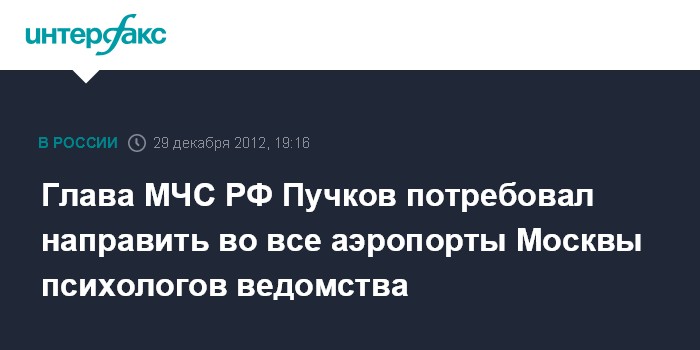 Москва. 29 декабря. INTERFAX.RU - Министр по чрезвычайным ситуациям РФ Владимир Пучков распорядился направить во все столичные аэропорты психологов в связи с крушением самолета Ту-204 в окрестностях аэропорта "Внуково".