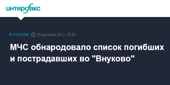 Москва. 29 декабря. INTERFAX.RU - МЧС России обнародовало список погибших и пострадавших в результате авиапроисшествия в аэропорту "Внуково" с самолетом Ту-204 Red Wings.