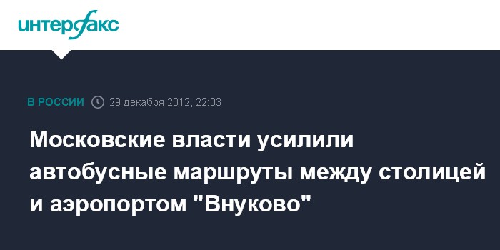 Москва. 29 декабря. INTERFAX.RU - Увеличено количество автобусов, следующих из аэропорта "Внуково" в столицу, сообщила "Интерфаксу" пресс-секретарь департамента транспорта и развития дорожно-транспортной инфраструктуры Москвы Жанна Терехова.